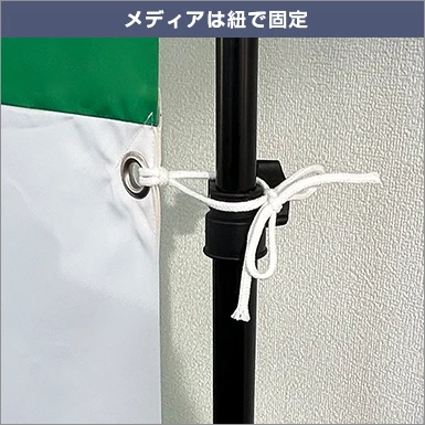 メディアは上下が棒袋、縦中央と下部はハトメ加工となっており、紐で縦棒にくくりつける仕様となっています。