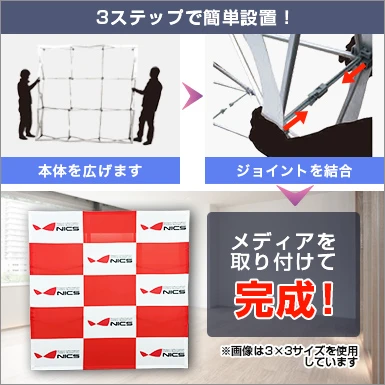売れ筋サイズの3×3タイプの約2倍の横幅を誇る「楽々バックパネル3×6」インパクトあるサイズとなりますのでオリジナルデザインを名入れ印刷する事で催事やステージを彩る背面幕に。大型サイズのバックボードなのに楽々設置が可能な事も魅力の一つです。