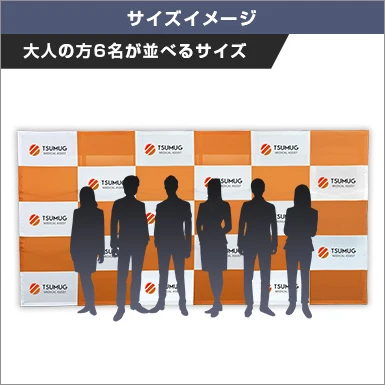 大人の方が6名並んでも収まる4メートル越えの大型サイズ。市松模様のプリントは、社名やロゴが大きく目立つので記者会見や表彰式のバックパネルにお薦めです。