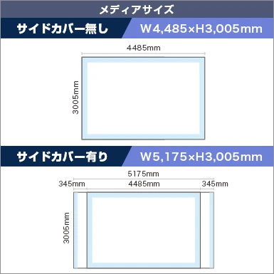 メディアのサイズは、サイドカバーの有り・無しによって変わってまいります。側面までメディアで覆う場合は、左右にサイドカバー分の布面積がプラスされます。