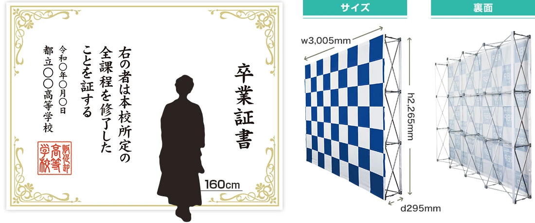 当通販店は格安価格にて様々なサイズのパネルを販売しておりますが、卒業式用ボードのオーダーメイド作成には大型ながら激安制作可能な楽々バックパネルの3×4サイズを使用しております。3×4サイズは実際の卒園証書及び卒業証書のサイズに比率が近似している為、等身大の卒園証書をプリントし製作する際に最適な大きさです。横幅は3,005mmあるので背面をしっかり覆い記念撮影が映えます。高さは2,265mmと圧迫感が無く、小学校の教室や大学のラウンジなど限られた場所へもフォトスポットの設置が可能です。