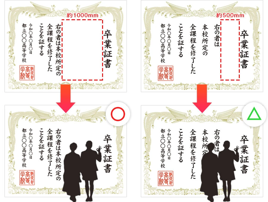 卒業証書・卒園証書のテンプレートは、予め「卒業証書」の文字と本文の間に約1~1.6mほどの余白を設けております。卒園証書の本文を変更されるのでしたら、ボードの前に立つ人とメッセージが重ならないよう、考慮した上でご注文下さいませ。成人の肩幅の目安は約43cmと言われ、お二人様で撮影される場合は1mほどの余白が必要です。ご発注の前に、記念撮影に入る人数を想定しオリジナルボードを製作することをお薦め致します。