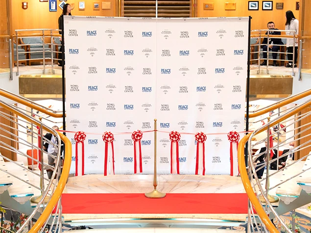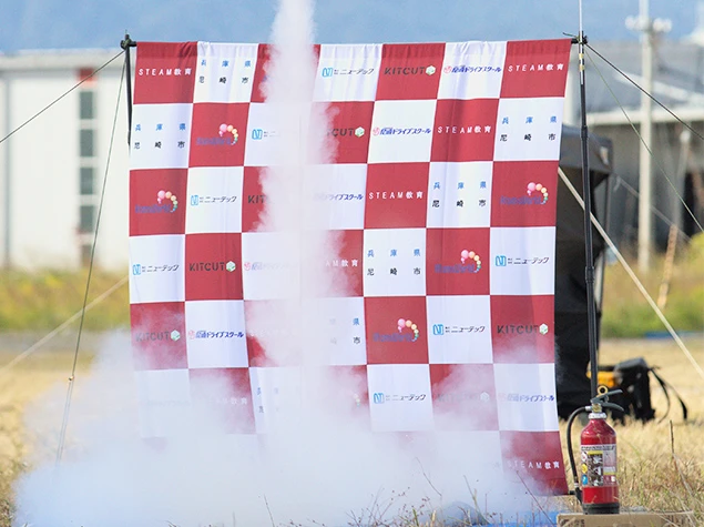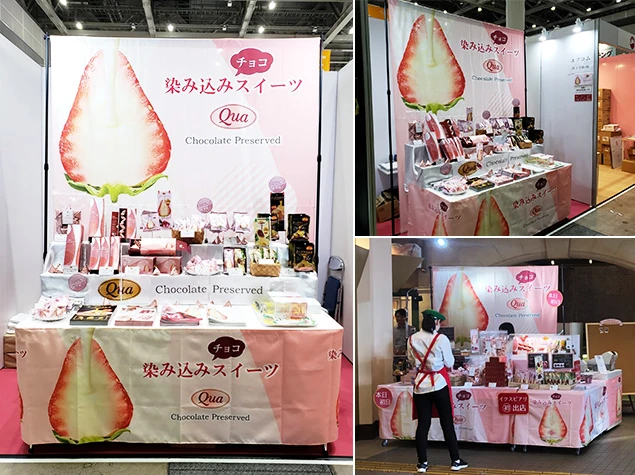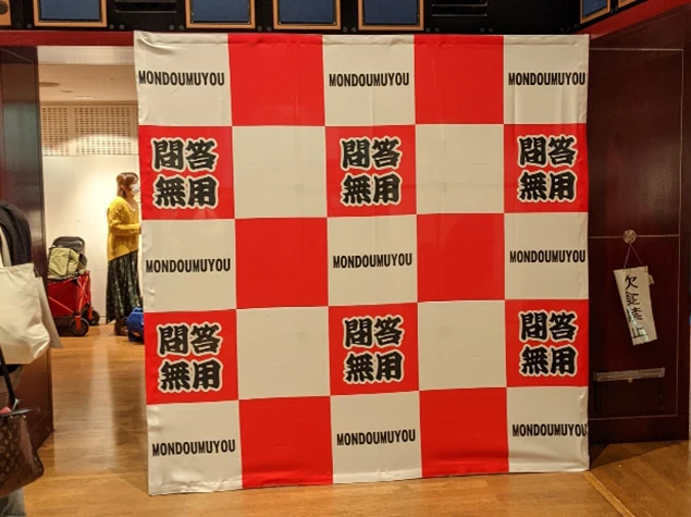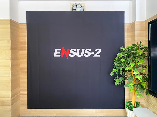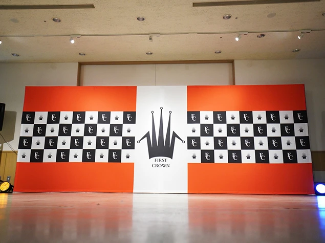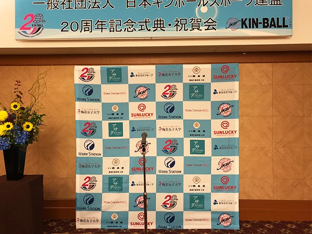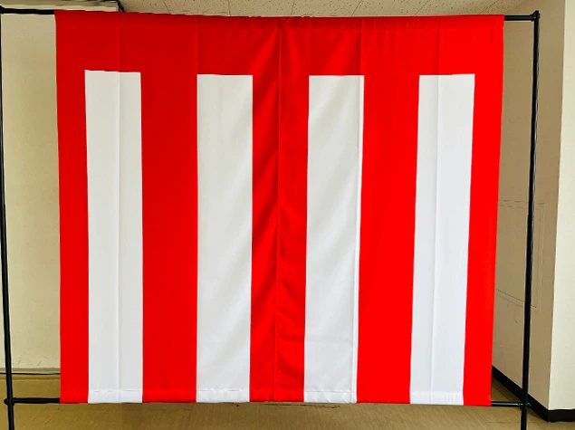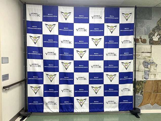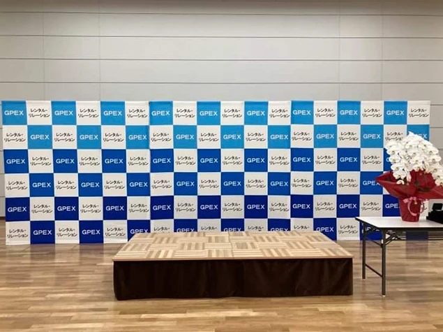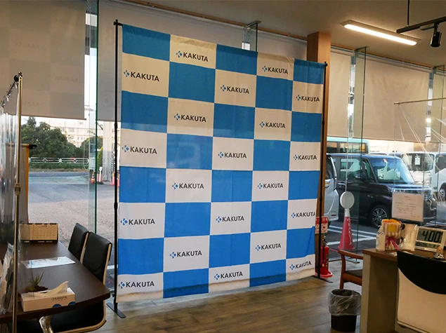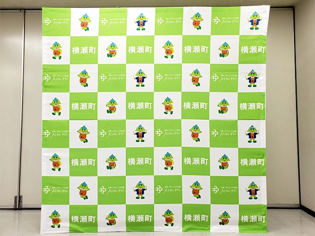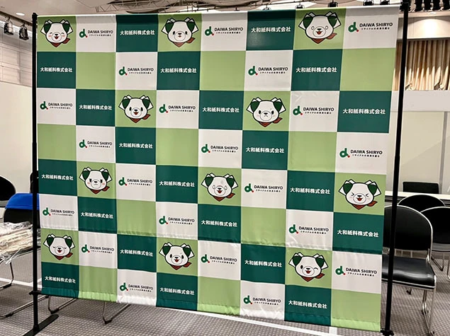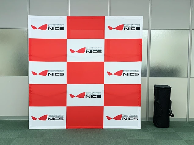 バナースクリーンサイズ w2,700×h2,400(mm) 本体 バナースクリーンワイド/1セット 生地 防炎トロマット 製作方法 昇華転写、片面フルカラー(CMYK値通り) 仕様 生地2枚繋ぎ、左右ヒートカット、上下棒袋(80mm)、防炎シール付き -
