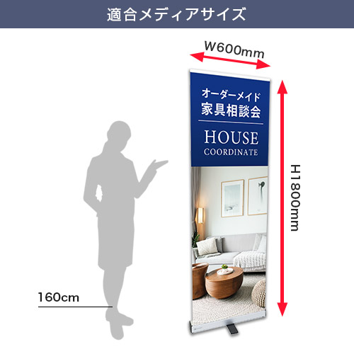 「エコロールスクリーンバナーZERO (600×1800mm)」のスクリーンサイズはW600×H1,800mmです。メディアが本体の中に巻き込まれるため、デザイン位置は注意が必要です。