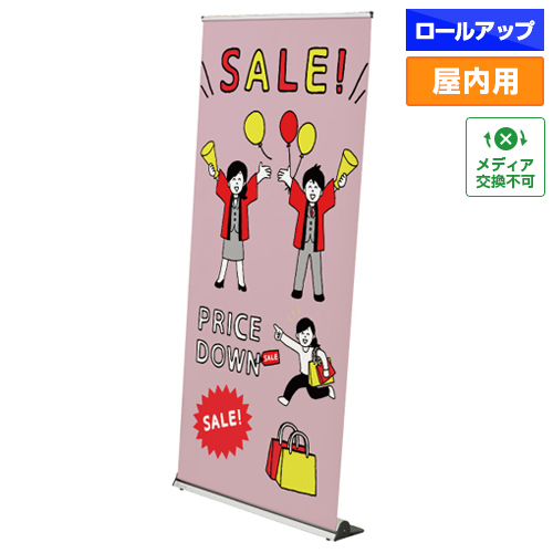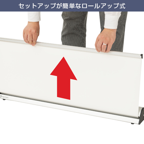 「スタンダードロールスクリーン (850mm幅)」は、抜群の安定感が前に倒れにくいロールアップバナースタンドです。土台には奥行きのある背面ベースが付いていて、アジャスターで重心を調節出来ます。メディアを引っ張り上げて簡単にセットアップできるため、説明会や催事の会場装飾にも好評です。持ち運びに便利な収納袋も付属しております。