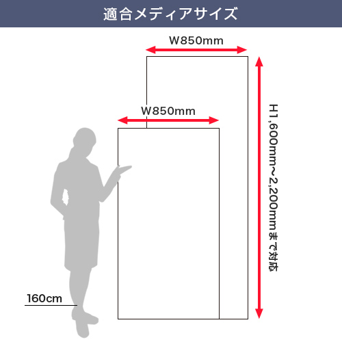 | 対応メディアサイズ | W850×H1,600~2,200mm(上部バーに約12mm、本体に約60mm程度隠れます。) |