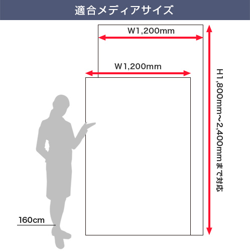 | 対応メディアサイズ | W1,200×H1,800~H2,400mm(上部バーに約12mm、本体に約60mm程度隠れます。) |
