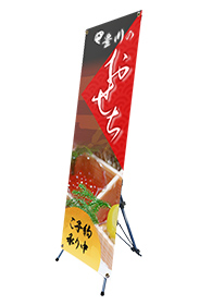 実地要綱を合わせてデザインする事で、キャンペーンの概要がわかりやすく告知できます。自立する特注のX型バナースタンドは場所を選ばず設置でき、人通りの多い屋外でも効果的なアピールが可能。