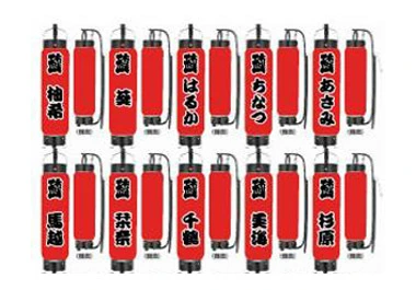 当店では小道具としての手持ちの祭り提灯も、格安なお値段にてプリント作成いたします。一つ一つに異なるお名前を名入れする事も可能となりますので、初めてのオリジナル製作の際もお気軽にご相談下さい。