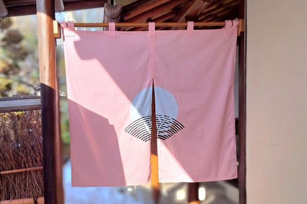 柔らかいピンク色の背景に、店舗様のロゴを染め上げた上品なデザインの店頭のれんです。