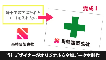 安全旗などミドリ十字の規定デザインに対して社名入れプリントなどを行うシンプルなデザインが定番となりロゴデータや社名の書体指定を頂けますと当店のデザイナーがレイアウト配置などオリジナル安全旗製作をサポート致します。