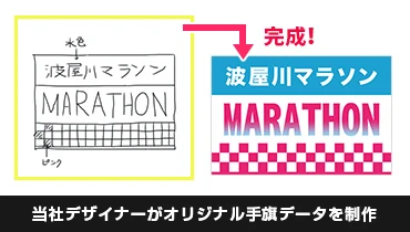 その際には手書きでレイアウトをご記載頂き当店へご送付頂きますとデザイナーが作成可能なデータ変換を行い応援用手旗のオーダー作成いたします。別途、難易度により変換手数料が発生致します。