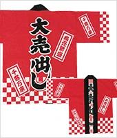 大売出しや商売繁盛などキャッチーなフレーズが事前に名入れプリントされている販促柄の既製品法被。業種に絞ったデザインでは無いので様々な店舗の季節イベントやセールのスタッフウェアとして人気がありアイキャッチによる販促効果も期待できる半纏です。
