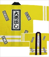 二本のラインが腰と袖にプリントされ短冊で様々な販促フレーズがデザインされている既製品大売出し法被。こちらは3色展開ですのでオリジナル大売出し半纏制作の際にはお好みに併せてお選び下さいませ。