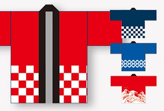 着用して店頭に立つ事でセール感を伝える事が可能な賑やかな市松柄の販促柄法被。特注作成の際には青と赤の2種類からお選び頂けます。