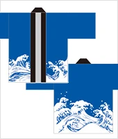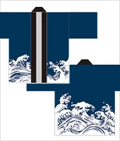 波飛沫を腰にぐるっとデザイン印刷された波柄法被。勢いを感じさせる事もあり背面や襟に、しっかり名入れ印刷する事でイベント催事を盛り上げるスタッフウェアになる事間違い無しの既製品半纏です。