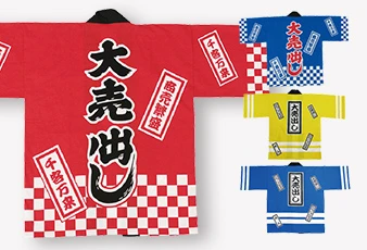 上下左右に正方形デザインを均等に配した昔ながらの馴染みあるデザインで人気の市松法被。様々なイベント用途で特注制作され活躍ができますよう豊富なカラーラインナップをご用意いたしております。
