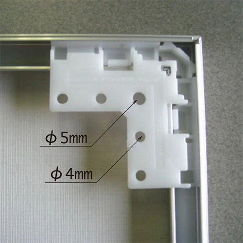 裏面のコーナー部には、φ4mmとφ5mmの穴を備えた樹脂製パーツを採用。フレームの結合を裏側から補強する構造により、軽量ながらもしっかりとした強度を確保しています。