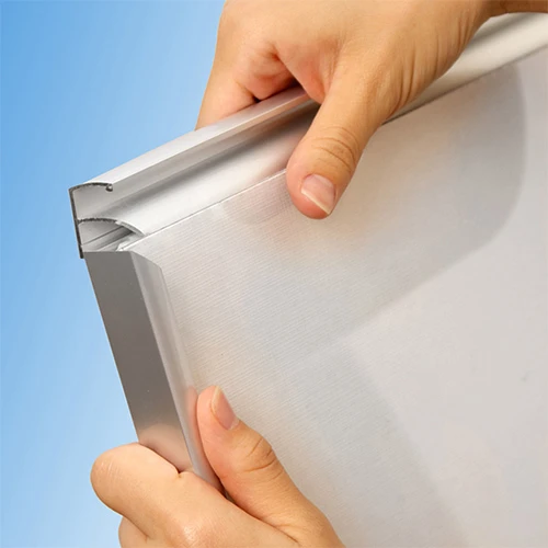 フレームの4辺を手前側に開くだけで、透明カバーを取り外せる前面開閉機構を採用しています。壁面に固定したままでも、繊細なポスターを傷つけることなくスムーズに交換作業が行えます。