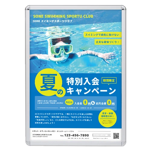 角が丸いR型だから、お子様連れのお客様が多い場所でも安心。指先一つでフレームが開くので、専用工具は一切不要。忙しい接客の合間でも、ササッとポスター交換が完了します。