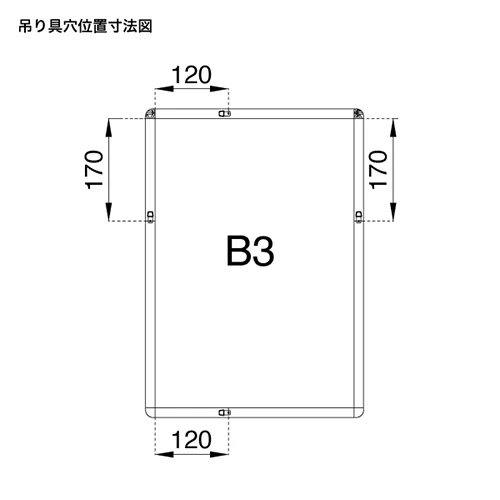 電車の中吊り広告でおなじみのB3サイズ(364×515mm)に対応。取り付け穴の位置は端から横120mm、縦170mmに設定されており、デッドスペースへの設置シミュレーションに役立ちます。