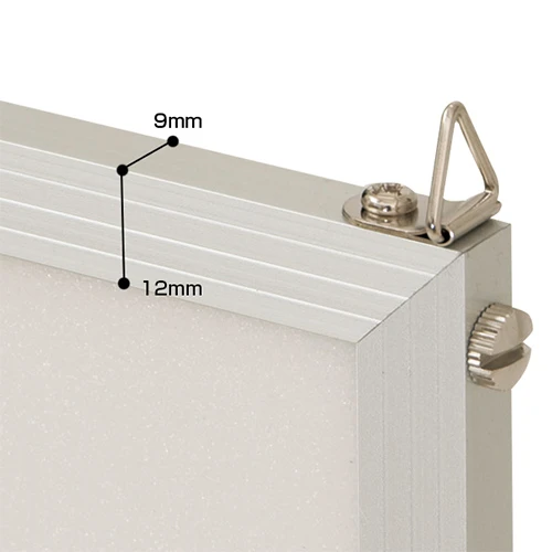 フレーム側面のネジを締めることで、掲示物を確実に固定する構造です。上部には三角吊り具が装備されており、ワイヤーやテグスを用いた吊り下げ設置にも即座に対応可能です。