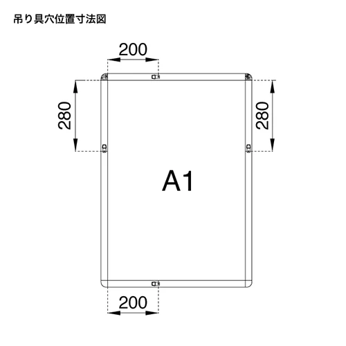 A1サイズ(594×841mm)に対応。吊り下げ穴は端部より水平200mm、垂直280mmの位置に設計されています。設置時のバランス確認や壁面施工の目安としてご活用ください。