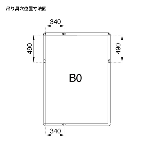 B0サイズ(1030×1456mm)という特大規格に対応します。背面の吊り具穴は端から横340mm、縦490mmの位置に配置。重量があるため、設置壁面の強度や下地を事前にご確認の上、施工してください。