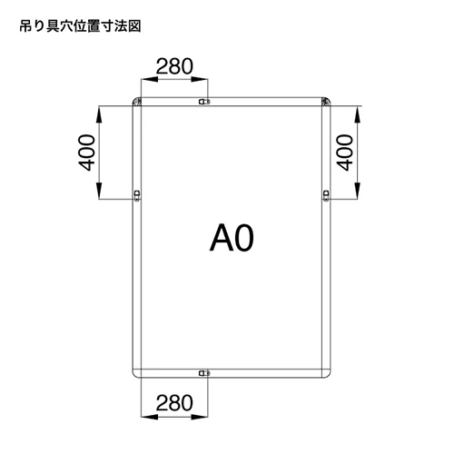 A0サイズ(841×1189mm)に対応する大型仕様です。吊り具用の穴位置は端部から水平280mm、垂直400mmに設定されています。重量があるため、設置壁面の強度確認および適切なアンカー選定にお役立てください。