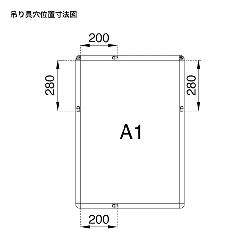 A1ポスター(594×841mm)に適合するサイズです。吊り具用の穴は端部より水平200mm、垂直280mmに配置されています。44mm幅のフレームは外寸が大きくなるため、設置スペースの確認にご活用ください。