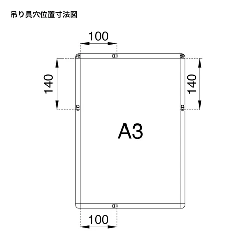 A3用紙(297×420mm)に適合するサイズ仕様です。吊り下げ用の穴位置は端部から水平100mm、垂直140mmに設定されており、施工時の正確な位置決めに資する設計となっております。