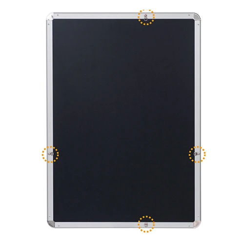 4辺のフレームを手でパカッと開くだけの「四方開閉式」です。ドライバーなどの工具は一切不要。壁に飾ったまま、季節のポスターやキャンペーン案内をササッと交換できる便利な構造です。