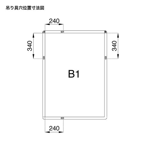 B1判(728×1030mm)に適合するサイズです。吊り下げ用の穴位置は、端から水平240mm、垂直340mmに配置されています。大型のため、設置の際は壁面の強度やスペースを十分にご確認ください。