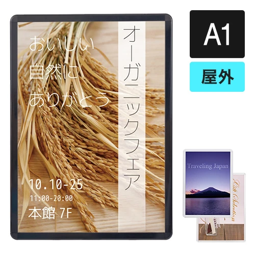 A1サイズは、庁舎外の広報掲示や施設の案内図として最適な視認性を確保。前面開閉式によるメンテナンス性の高さも特筆すべき点です。格安な価格設定に加え、ポスター印刷との一括導入で、低コストでの掲示に最適のポスターパネルです。- 屋外用
