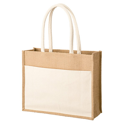 ジュート&キャンバスポケットトート(L)(TR-1216)は、大容量のジュートバッグにキャンバス生地の外ポケットとハンドルを付けたトートバッグです。A4サイズが余裕で入る頼もしい大きさで、オープンキャンパスでカタログやクリアファイルを持ち帰る際の配布バッグに最適。外ポケット付きで機能性も高く、デイリーバッグとして物販グッズのプリント製作にもご利用いただけます。ロゴのワンポイントから大きな写真プリントまで、当店ではオリジナル印刷を通販専門店ならではの格安価格で承っております。