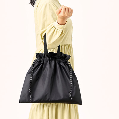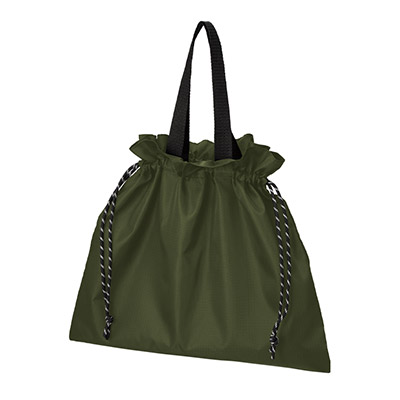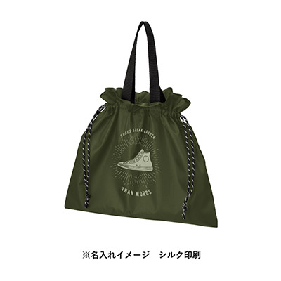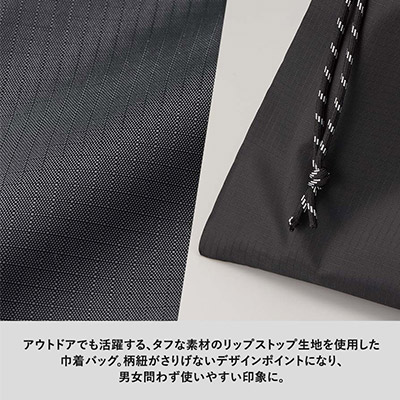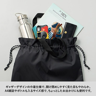 - A4書類もすっぽり収納。アウトドアテイストと実用性を兼ね備えた、名入れ可能な巾着バッグ。