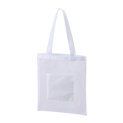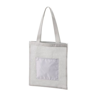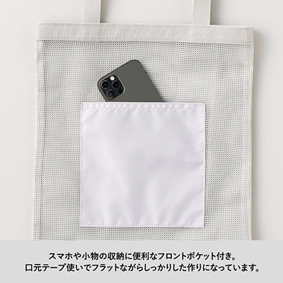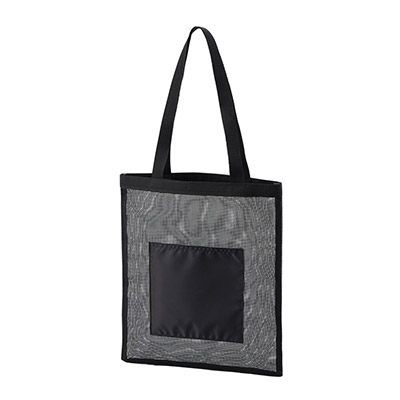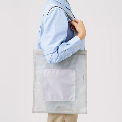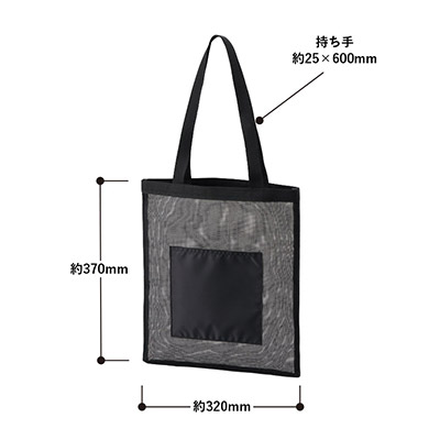 - 涼しげな透け感がトレンド。A4書類も入るポケット付き、肩掛け可能なメッシュトート。