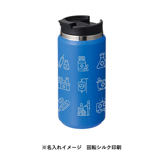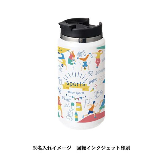 側面360度への回転インクジェット印刷イメージ。フルカラーでイラストやロゴを鮮明に表現でき、イベント物販品や記念品として、視覚的なインパクトと高い訴求力を発揮します。