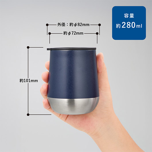直径約82mm、高さ約101mm。両手で包みたくなる愛らしいラウンドフォルム。280mlの容量は、コーヒーブレイクでほっと一息つくのに最適なサイズ感です。