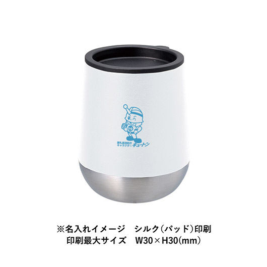 曲面に映えるパッド印刷などで名入れが可能。キャラクターやロゴをワンポイントで入れれば、カフェ雑貨のような雰囲気に。物販品としても人気の高いデザインです。
