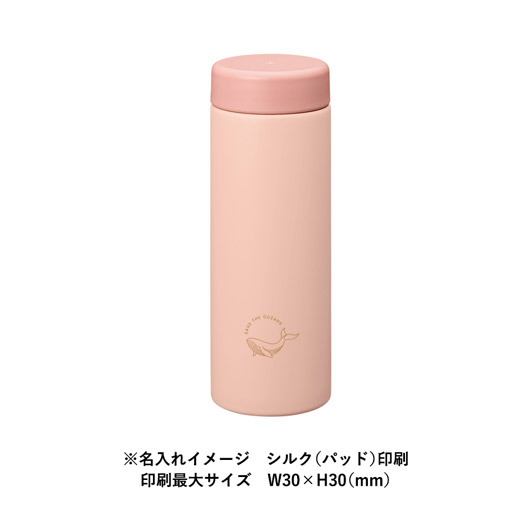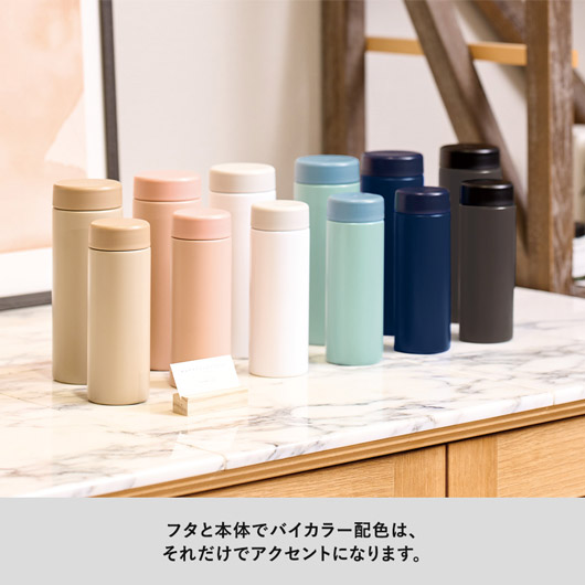 キャップと本体の配色がお洒落なバイカラーデザインは、小さなワンポイントデザインの特注名入れもお似合いです。さりげないオリジナル印刷でも、デザイン性がグッと高まります。