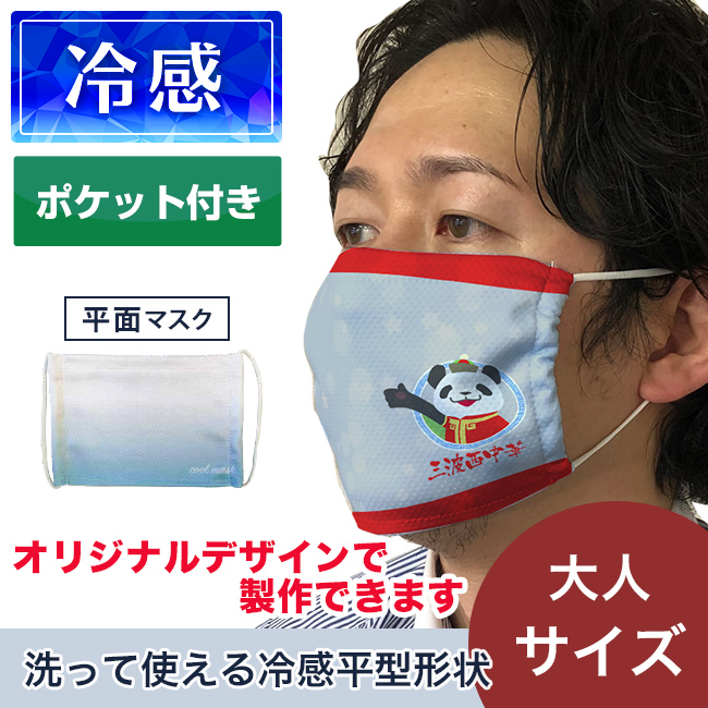 馴染みある平型形状の洗って使える冷感マスク。オリジナル製作でノベルティや物販に。